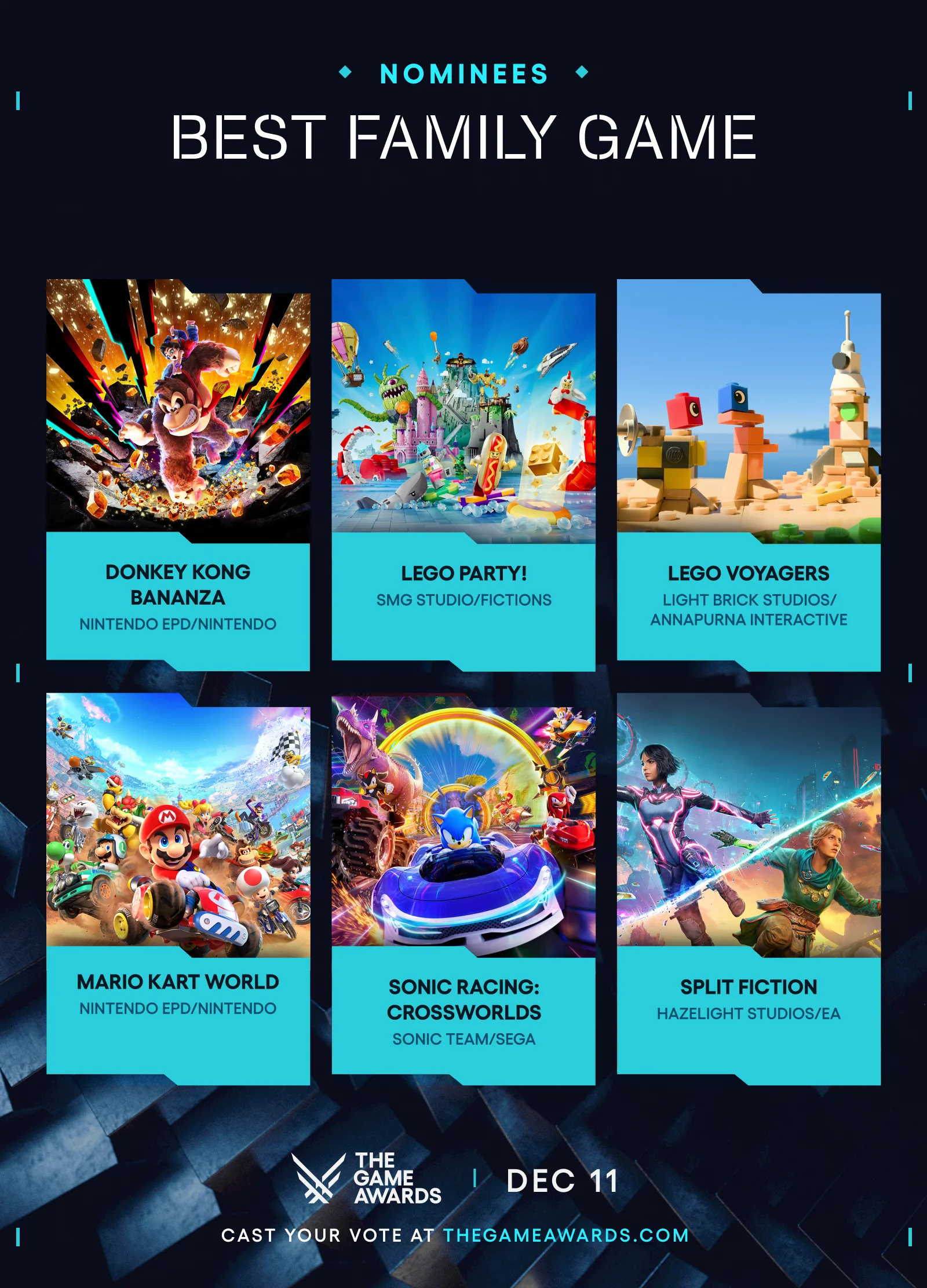 The nominees for Best Family Game of the Year include Donkey Kong Bananza, LEGO Party!, LEGO Voyagers, Mario Kart World, Sonic Racing: CrossWorlds, and Split Fiction.