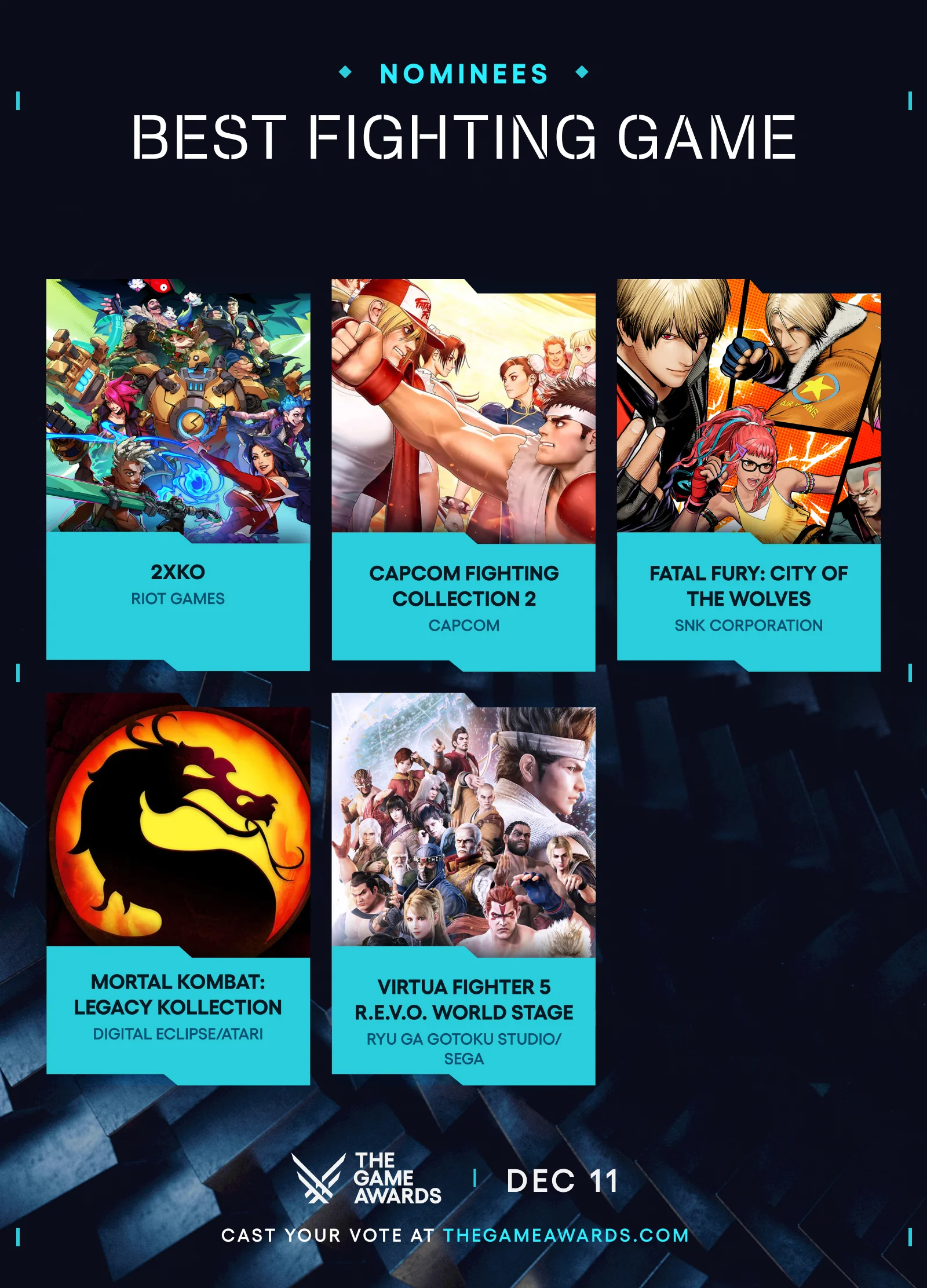 The nominees for Best Fighting Game of the Year include 2XKO, Capcom Fighting Collection 2, Fatal Fury: City of the Wolves, Mortal Kombat: Legacy Kollection, and Virtua Fighter 5 R.E.V.O. World Stage.