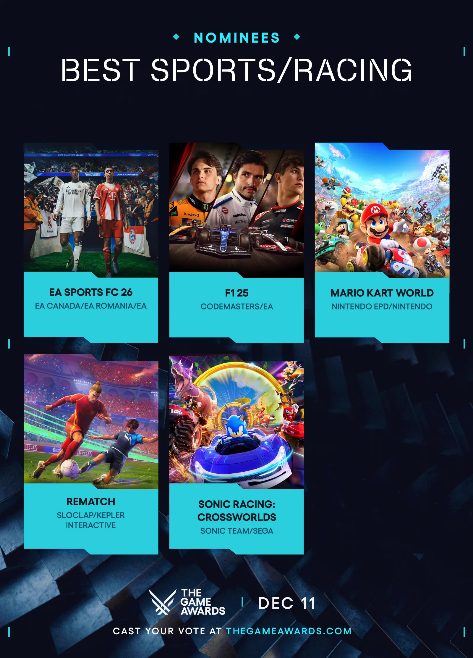 The nominees for Best Sports/Racing Game of the Year include EA Sports FC 26, F1 25, Mario Kart World, REMATCH, and Sonic Racing: CrossWorlds.
